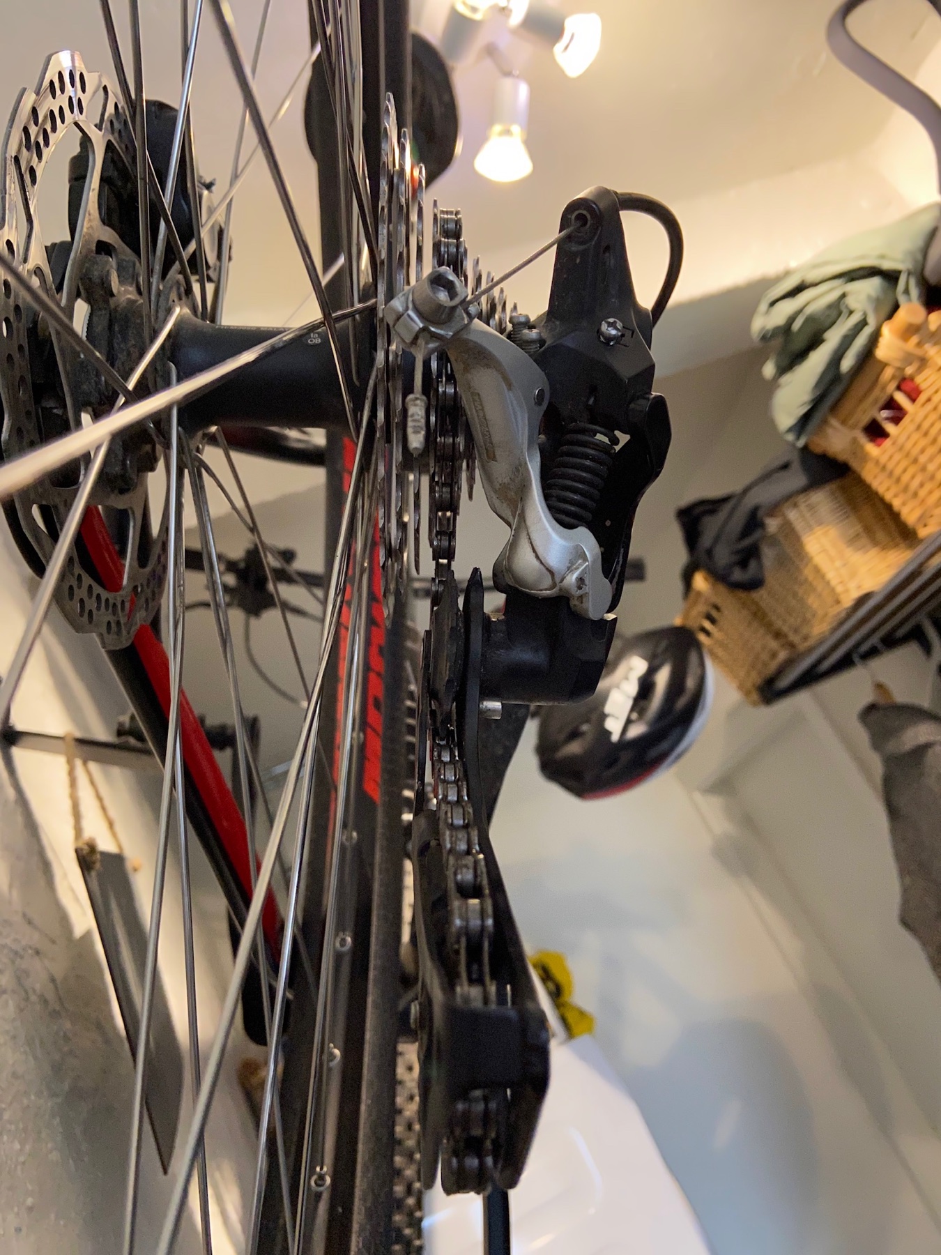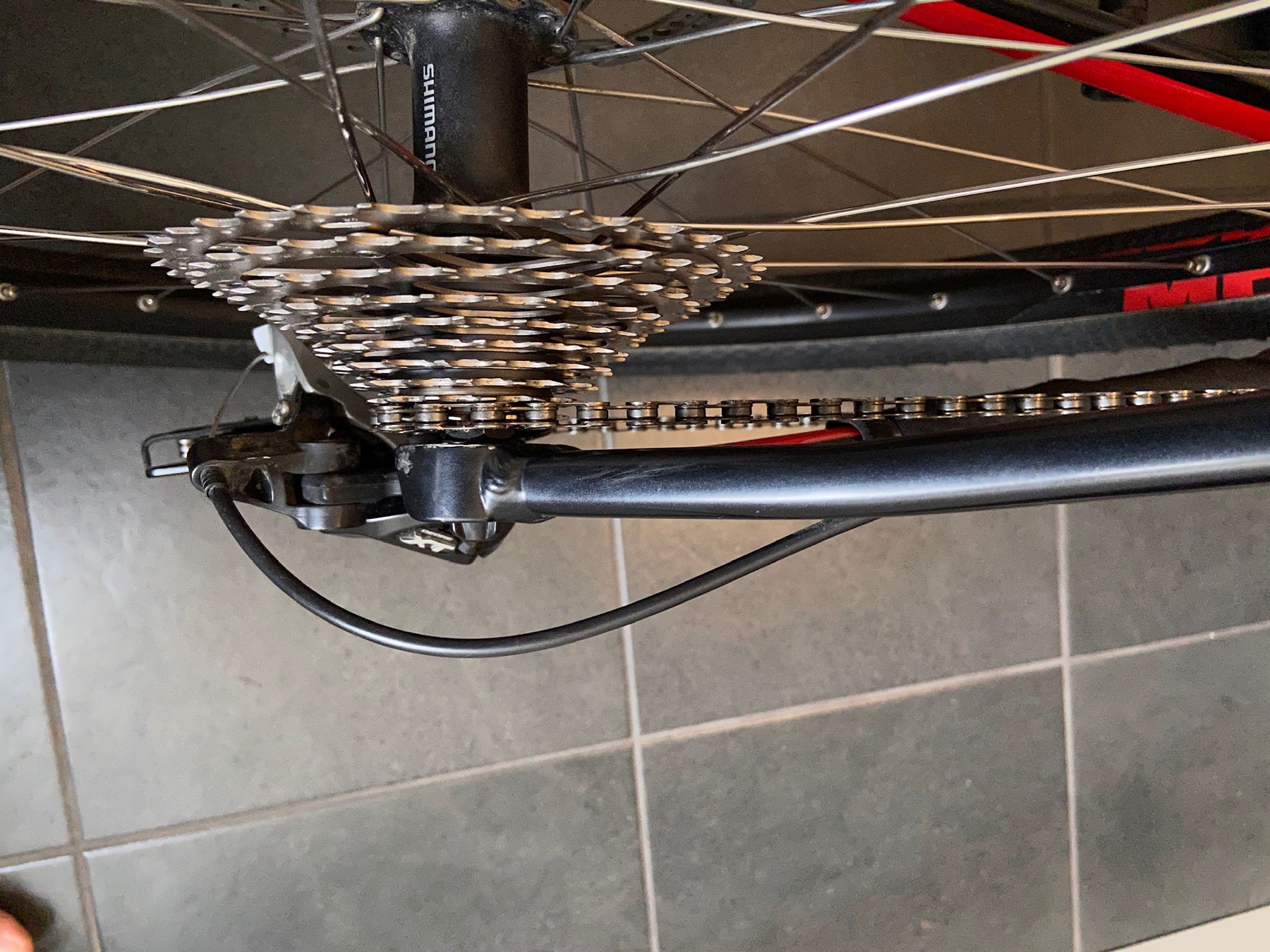 Det viser sig at de to pulleyhjul på bagskifteren peger ind mod cyklens center (se vedhæftet).