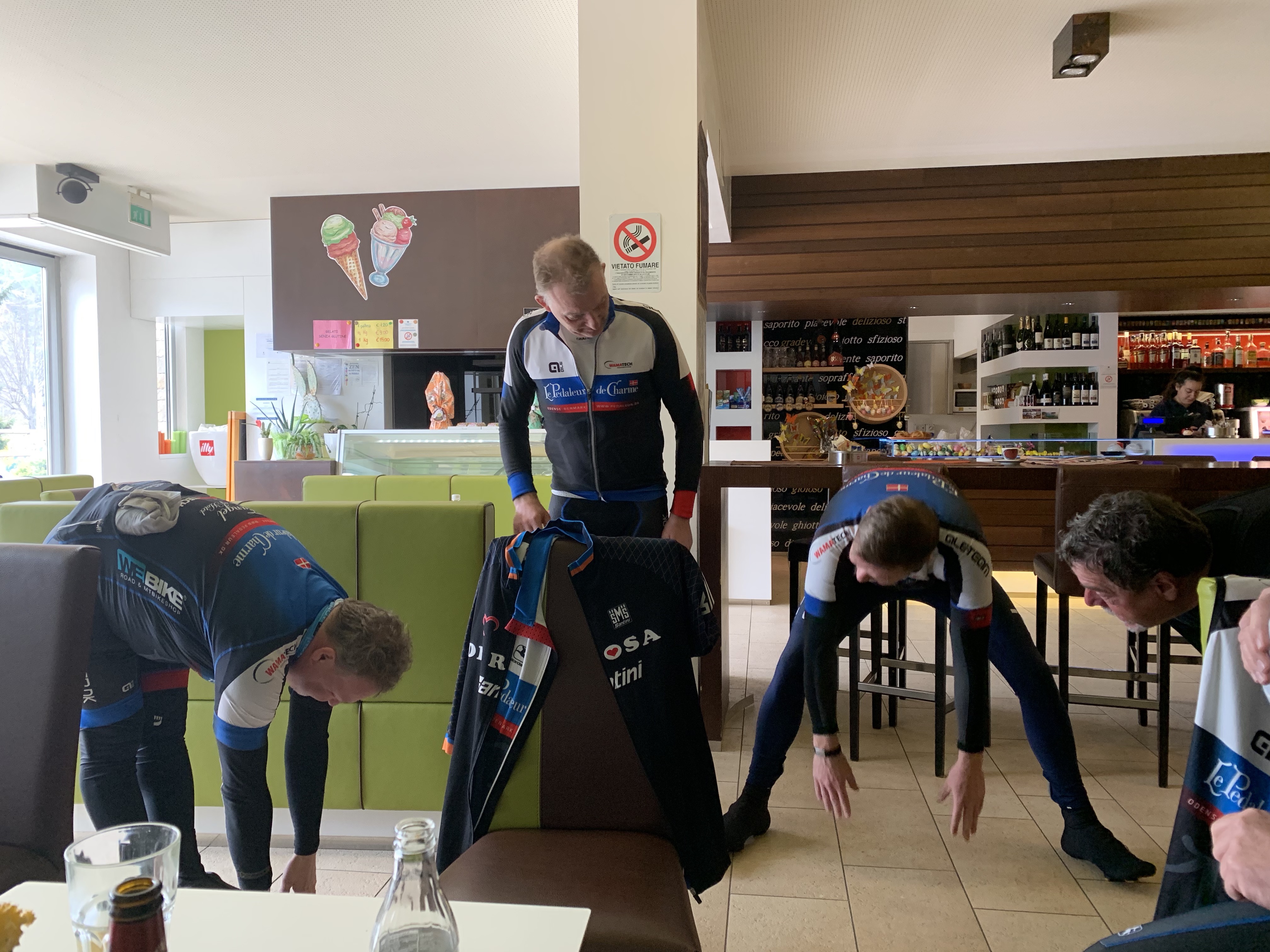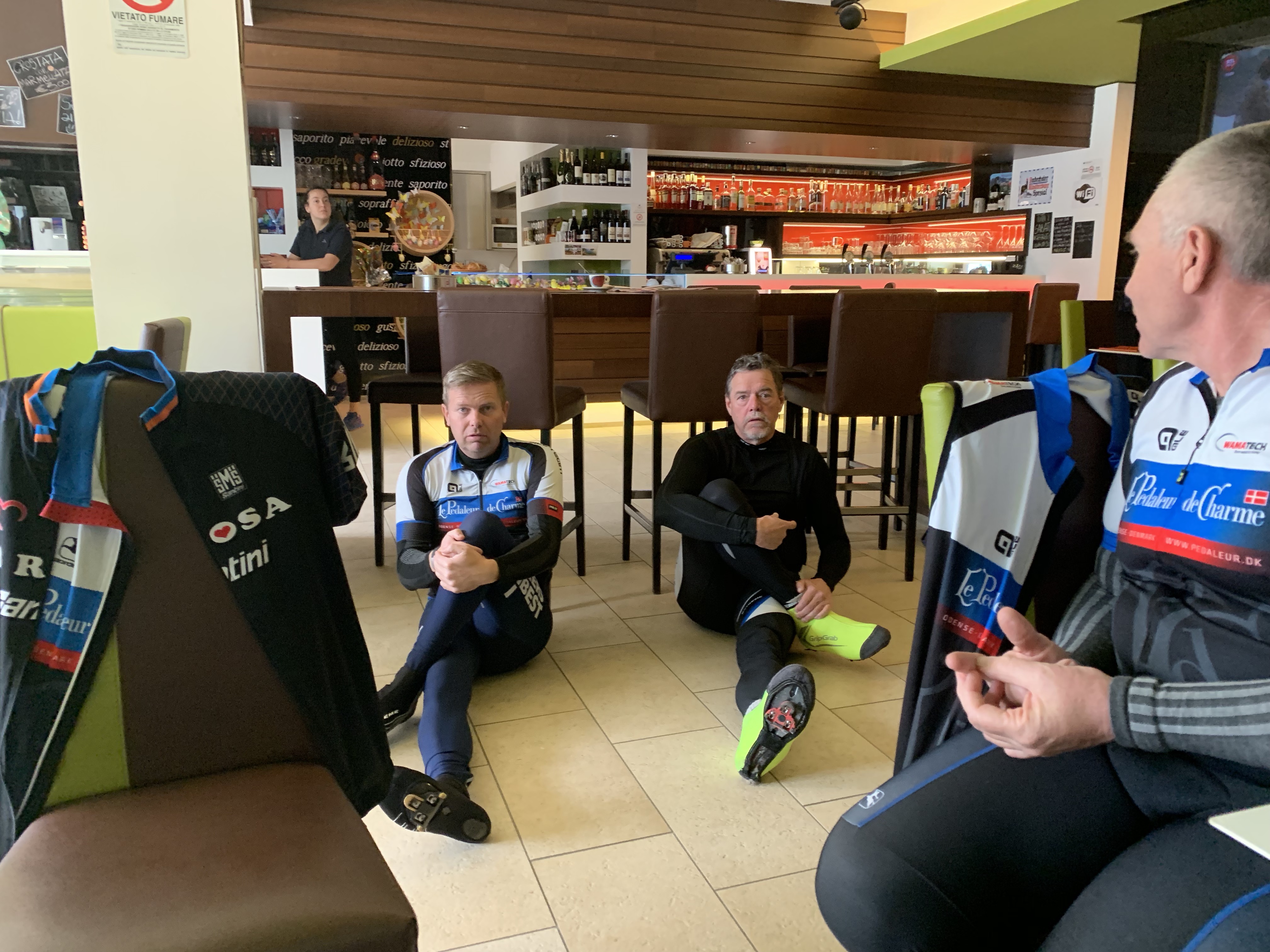 Hjulet var flekset, men han kunne trille stille og roligt videre ned til et spisested, hvor vi fik pasta. Ronny fik et forspring ned ad bjerget, men på mirakuløs vis lykkedes det ham at komme først ned til søen. Den eneste forklaring jeg kan finde på er han jo ikke kunne bremse på baghjulet, og så må det jo gå stærkt